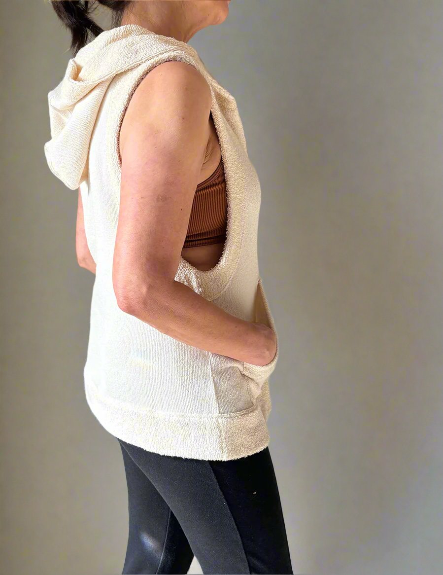 Made from organic cotton and recycled polyester terry, the women's sleeveless hoodie is both snuggle-worthy and sweat-worthy.